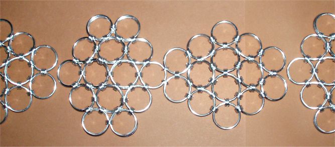 First add-on: With a bit thinking-ahead, weaving of the six truncated diamonds can be a bit easier, if one follows the photo (that was shot during weaving of the L prototype). Do not weave with single rings all around, before doubling up, but set the four rings as shown in the center, add 6 (4 for the small ball type) connectors, and then double up, before setting the other core surrounding rings. You'll see soon, why I suggest this...
