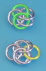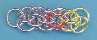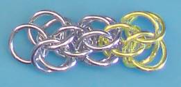 Here a step-for-step tutorial for both, in ORAAT manner is given; there are 'speed weaving' methods using more preclosed rings, but find these on your own. Rings added to the weave in every step are marked yellow. For this tutorial I used my 'Standard Persian Demo' rings, made from BA 1.6mm, coiled on 8.0mm mandrel, with a final AR of 5.35 - both weaves' minimum AR is in the 5.0 region, and while there's no geometric upper AR limit, I'd propose to avoid going above an AR of six, if not further modificatians are planned, that necessitate this.