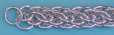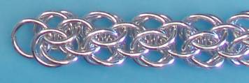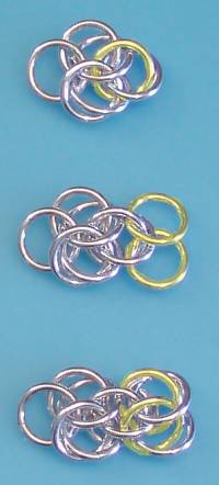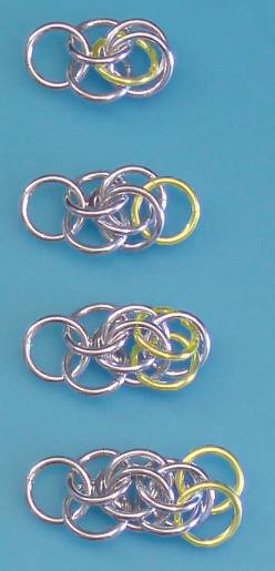 Step 4: Add a further ring pair, again woven backwards to create a further Byzantine-like cell, but 'locked' by weaving through Step 1's single ring.