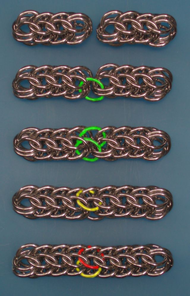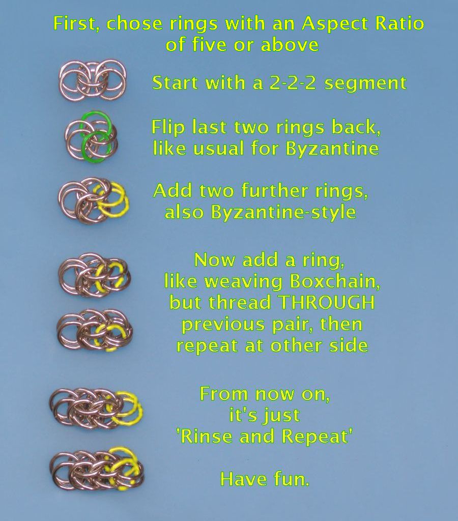 This weave is one of the basic standard weaves, and so should be taught to every new aspiring mailler as one of the very first weaves. It works with rings above an AR of around 4.9 - there is principally no upper AR limit. The 'sweet spot' AR is imho in the 5.5 region, and above an AR of around 6 it becomes imho a bit too loose. I propose to learn it with BA rings 1.6mm (~16swg) coiled on 5/16" or 8mm mandrel - these differ only minimally and result in an AR in the 5.1 to 5.3 ballpark. But if you have e.g. 16swg 3/8" ones (AR~6.3) around, this should not hinder you to use these. If you want it a bit smaller, 1.2mm (18swg) coiled on 6mm or 1/4" mandrel are fine. This tutorial's sample chains were made from 1.6*8.0mm rings.