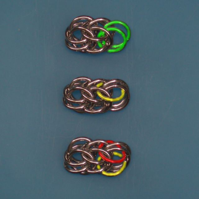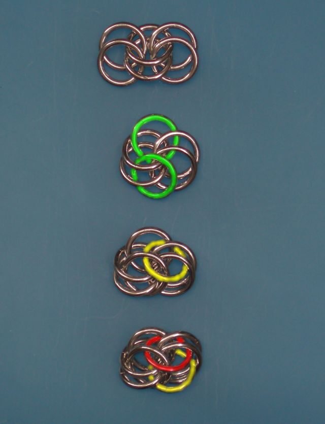 4) Arrange the 'green' rings, as just told. This can be a bit difficult, as the ring positions are far from stable, and rings can yet slip out of their supposed-to position. Now add a ring (yellow), as shown in the image, and in a similar manner as lengthening a FP chain. Now you just have to thread this ring also at the proper position, SANDWICHED between the followup chain's horizontal pair, but also stacked above the first (left) one's horizontal pair. So the pattern is followed continuous, and now the vertical rings of the previous steps are finally locked in position.
