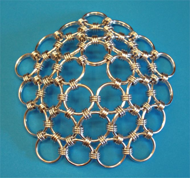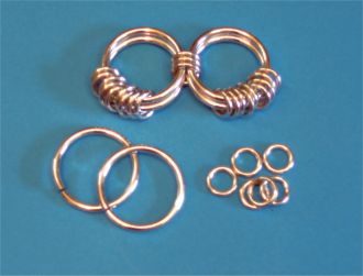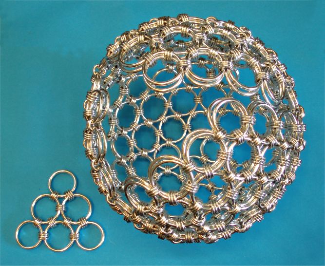 First, get and prepare your rings. I calculated (and tested) a couple of combinations of four ring types for this body. In this tutorial I show the creation of the most perfect sphere I achieved yet. There are some smaller and larger ring combinations around, but they are either not so perfect adjusted to each other, or I could not yet acquire the proper mandrels to make the needed ring sizes. There are two large face ring types, and a smaller one for the twelve corners, plus a connector ring size. I needed two slightly different large face ring types, to be able to weave already an appropriate surface bend into the triangles.