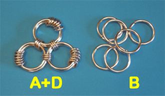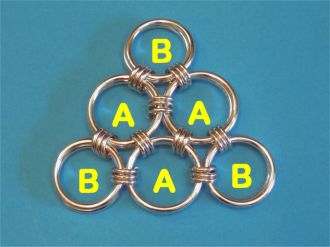 As shown in the images, first grab twelve (8) preclosed connector (D) rings with a large (A) ring, and then double the large one up with a parallel one. Thereafter weave a large ring through three (2) of the connectors, and add nine (6) new connectors to that one before closing - and double this large ring up as well.