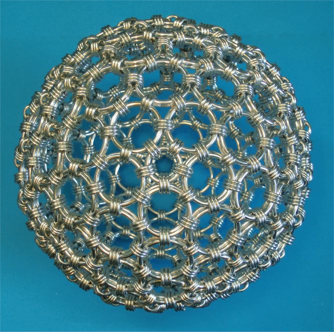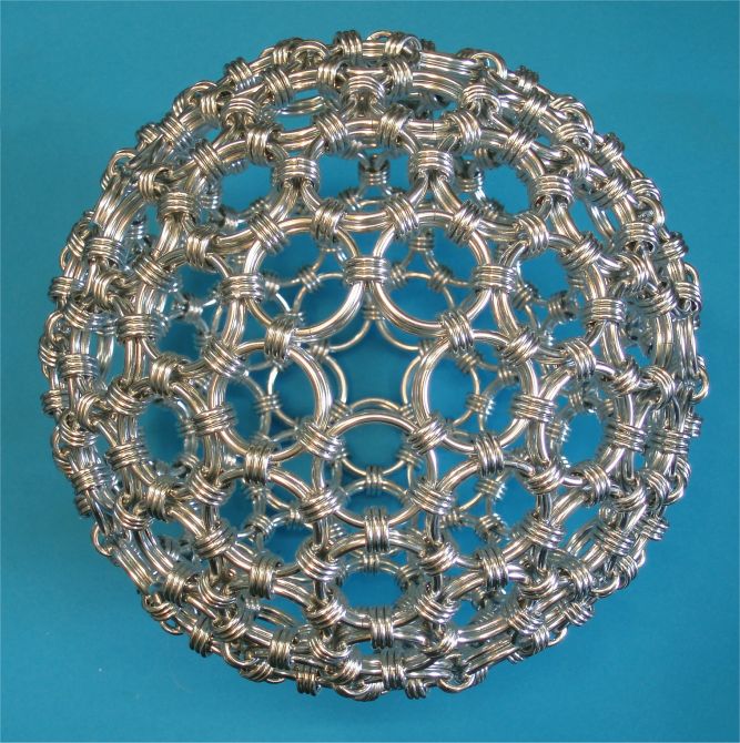 But we have yet the stowed-away (C) rings remaining. These fit well into the pentagonal holes (as used to, as paired rings), and serve also to rigidize the finished sphere - it may be a bit fiddly to add them, but after near a thousand connector rings are set, these are really just the icing on the cake, and should pose not more any issue at all. One hint I can give after having woven quite 'a few' spheroids is, that some people (me included) fare better, if the C 'bud' rings are already placed while building up the bowl, as the access to the mounting spot is easier.