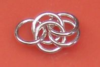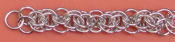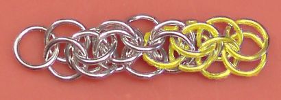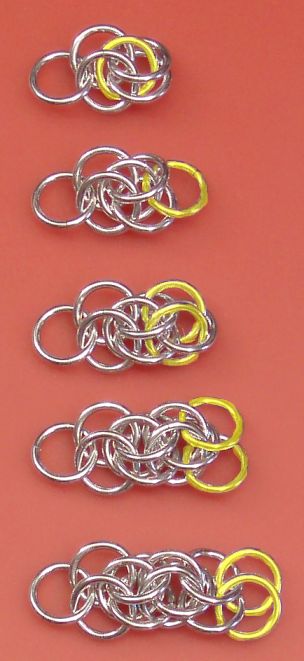 Repeat steps 1-5; note that this added segment is rotated 90 degrees against the 1st one. Always use the 1 backwards, 1 forward, 2 backwards, 2 forward, 2 forward succession - added single rings are always sandwiched between previously woven ones, and added ring pairs (except for step 5) sandwiching previous single ones.