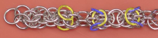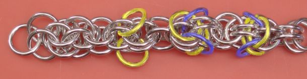 Step 2: Add two further rings per cell (marked blue here), also on the double-ring side, to build Box-like cells that hold the previously set yellow rings - note that you have to weave through four and around two rings in this step. Repeat throughout the chain.