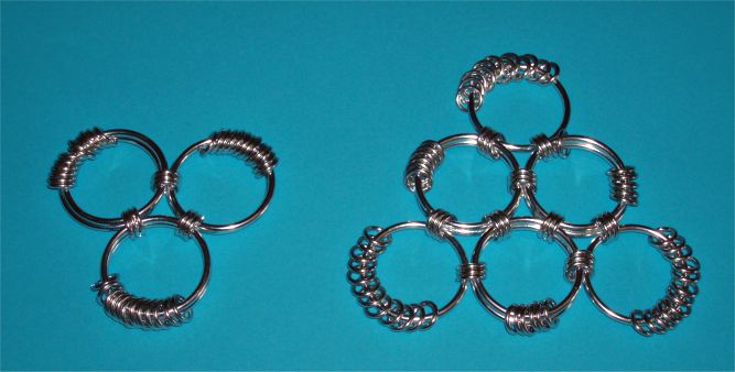 I recommend to repeat this, until you have twenty of these triangle cores, before continuing. Once done, the bag with remaining 'X' rings can be laid aside, and the 'O' ring bag opened, as we continue now with these.