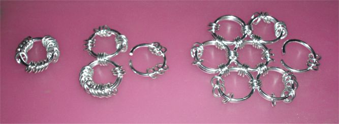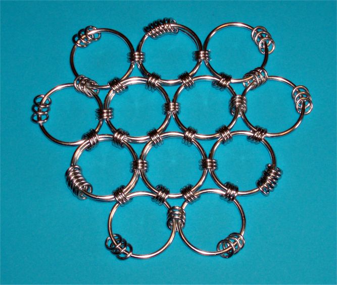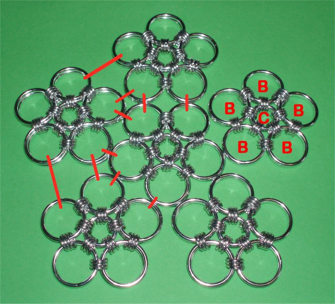 Next step, of adding six (6) connectors to a fresh A ring, going through 3 core, and three of the previous large ring's six addon connectors, and doubling up, repeats four times.