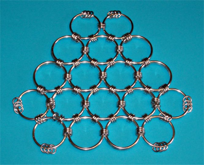 The 92-face Yetsanihedron is an inbetween design of standard 72-face spheroid, and the 132-face Insanihedron - geometrically seen, it resembles an Icosidodecahedron, with its twelve pentagonal surfaces built from six sub-faces, represented by rings, while the twenty triangles become hexagons, in maille - or see it as a snub dodecahedron - maille can be so crazy, that depending on interpretation of a ring's function (face, edge, or corner) often dual or even multiple interpretations are possible.