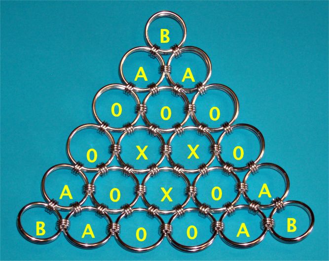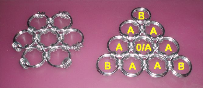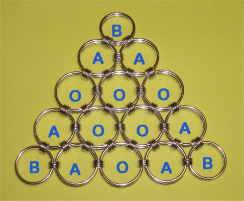 The final step is easy - just add a 'B' ring pair at each of the corners, and you're done with triangle building. You may note, that the triangles have already the 'wish' to bend a bit, what results in the end with a nicely bent surface, that goes conform with the spheroid shape of this triangle in the finished ball. The 'O/A/B' ring pair placement is also shown as reference in that photo.