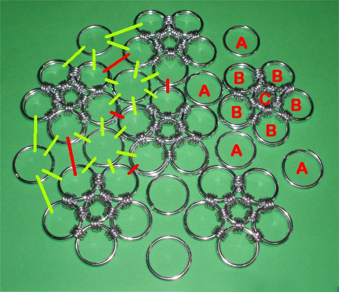 Then add eighteen (18) connectors on a large (A) ring, and after closing, add a parallel A ring, to double up.